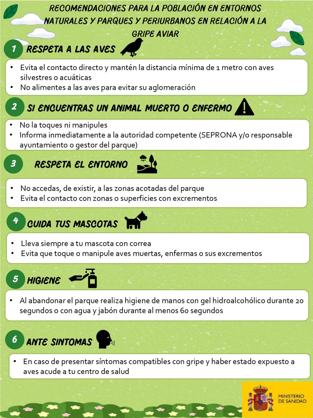 Para la población general: evitar contacto con aves muertas o enfermas, no alimentar a aves silvestres en zonas donde puedan confluir con aves de corral, y respetar las indicaciones de las autoridades locales si se cierra un parque, estanque o zona similar.